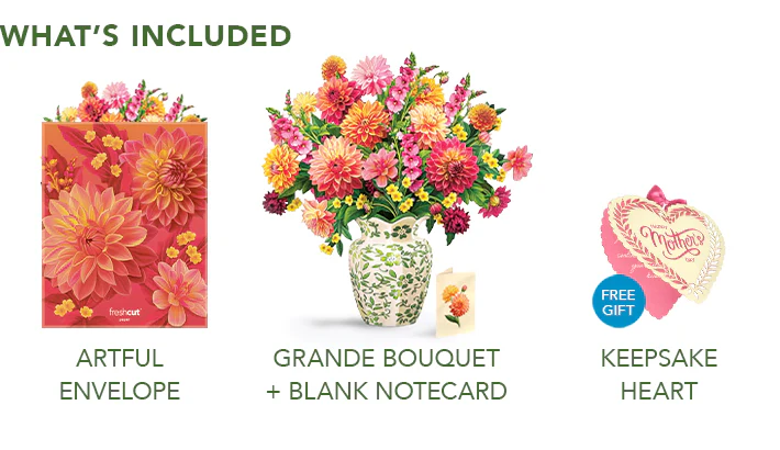 Celebrate Mom this Mother's Day with a gift as warm and radiant as she is. This Special Edition Bouquet comes with a Free Keepsake Heart thatshe'll hold onto long after Mother's Day. Our Grande Dahlia Sunrise Bouquet is bright, cheerful, and alive with every shade of the sunrise, lush tangerine, cheerful coral, and playful pink blooms that instantly lift the mood from every angle. Elegant and joyful, it's a beautiful way to share warmth, happiness, and sunshine with the woman who deserves it most.