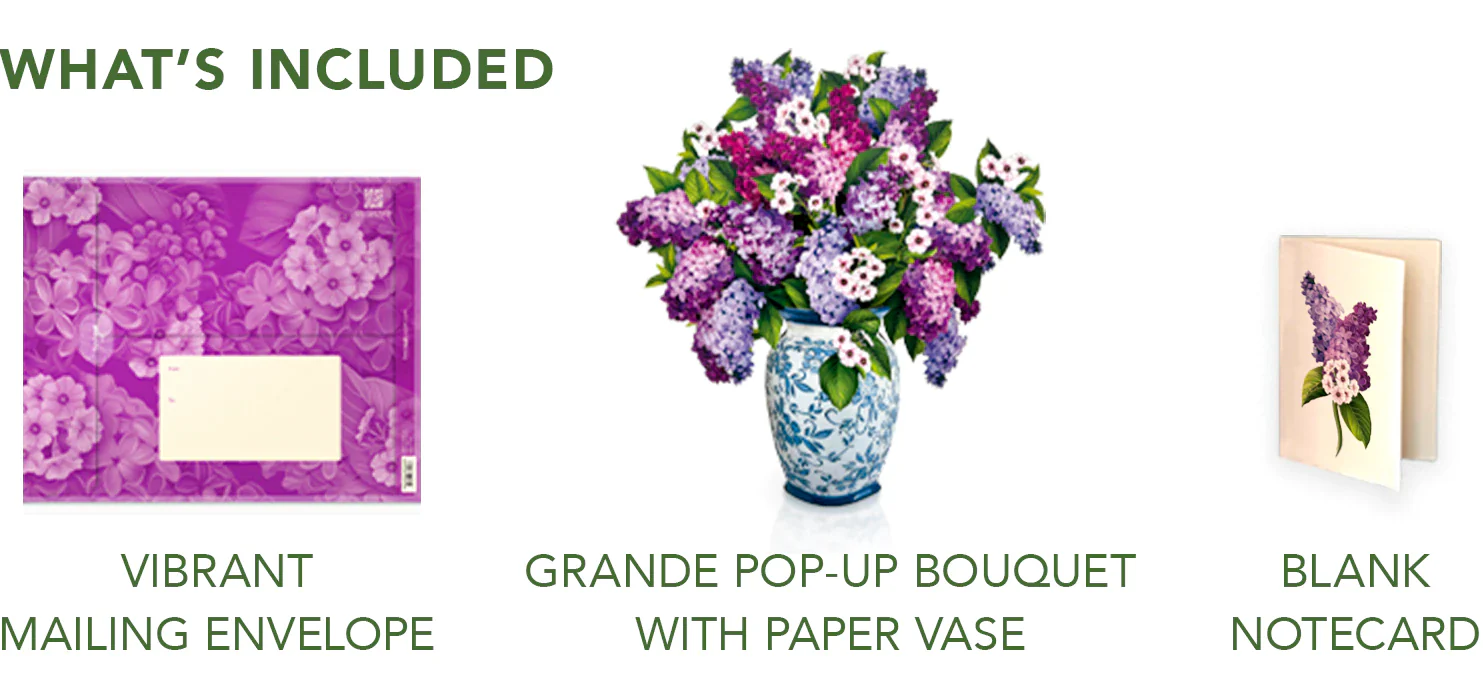Inspire your space with the lush greenery and luminous purple hues of Grande Garden Lilacs. Featuring all the beauty of your favorite springtime flower without the harsh fragrance or fleeting blooming season. This dramatic and elegant display stands at 22 inches tall with three dozen stems!