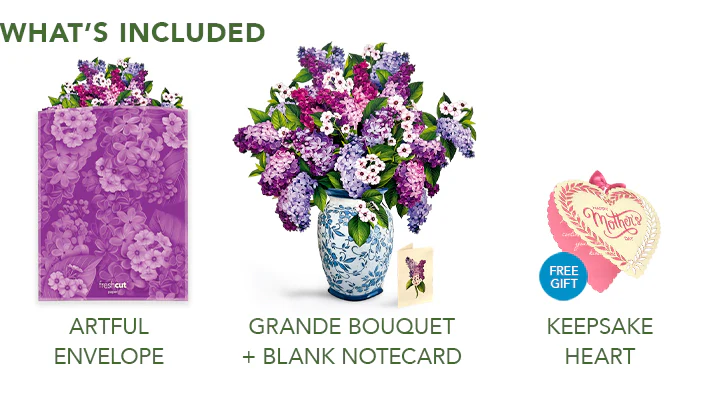 Celebrate the mom who makes every space more beautiful with this special Mother's Day edition of our beloved Grande Garden Lilacs. Lush greenery and luminous purple hues come together in a dramatic and elegant display, standing 22 inches tall with three dozen stems, all the beauty of your favorite springtime flower without the fragrance or fleeting blooming season. Nestled within the bouquet, a sweet pink heart holds a heartfelt message, making this timeless gift as meaningful as it is stunning.
