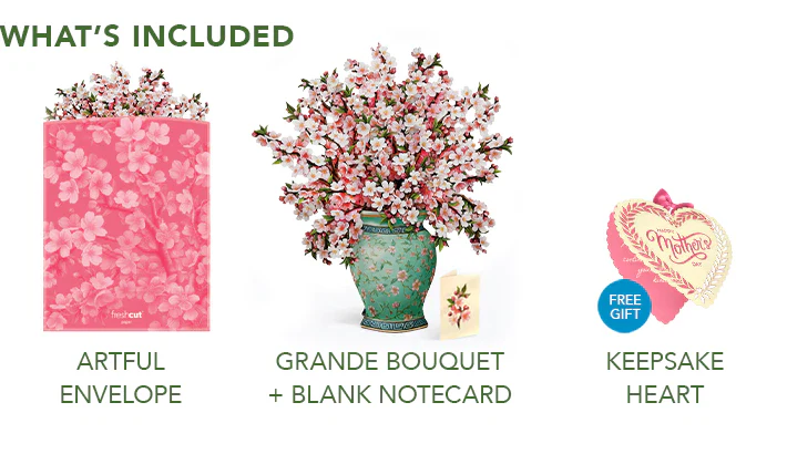A fresh take on a beloved classic. The Grande Japanese Cherry Blossom Bouquet pairs soft pink petals and an ornate jade-inspired vase with our sweet Pink Mother's Day Heart for a truly special gift set. Capturing the quiet beauty of spring while blooming year-round, it's a heartfelt way to show Mom just how much she means to you.