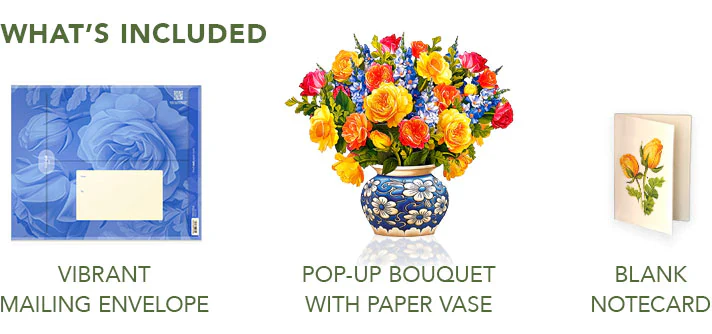 A variety of elegant roses rich in sorbet shades harmonize with blue-moon-hued snapdragons in this grande paper bouquet. Raspberry red, tangerine orange, strawberry pink, and limoncello yellow radiate out from standard and garden roses with additional tender textures in a fitting blue and white floral vase. Symbolic of passion, love, and courage, FreshCut Paper’s Sorbet Roses are a fresh and sweet delight. In this grande size, our delicious paper rose bouquet showcases their vivid and artful design like a topiary you can bring into every corner of your home.